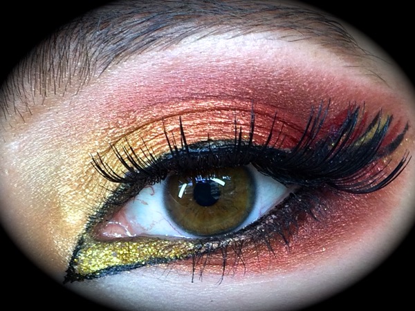 Here's the makeup I wore inspired by the new Mockingjay movie with elements of fire in the shimmery eye shadows from Sugarpill and Inglot and bird aspects with the feathery eyeliner, lashes and yellow glittery inner corner beak aspect using Eye Kandy glitter.
